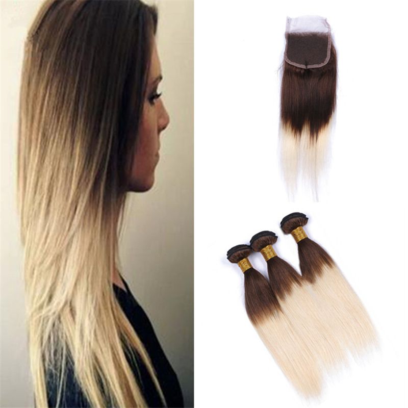 Light Brown To Blonde Ombre Straight Bundles With Closure Brown Roots 4 613 Indian Human Hair Weaves With Lace Closure