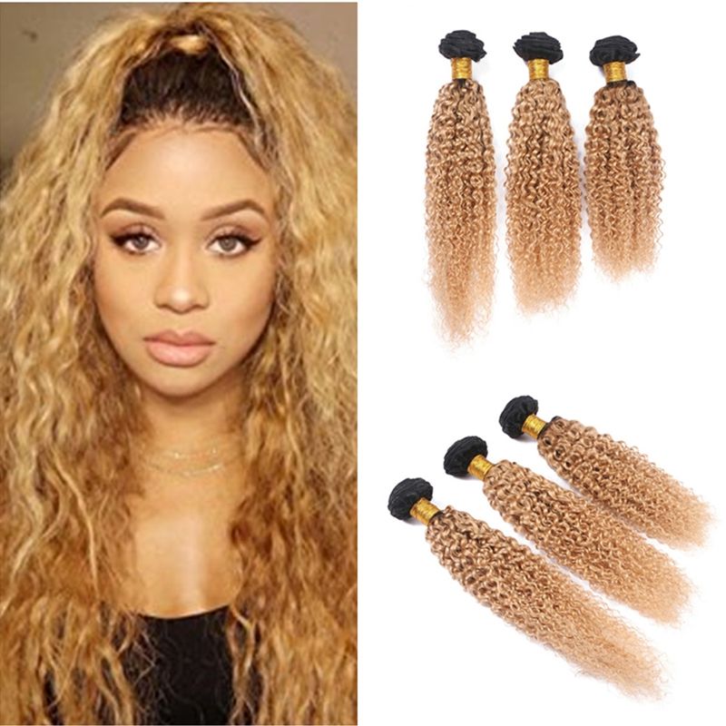 Dark Root 1b 27 Afro Kinky Curly Hair Weaves Two Tone Honey Blonde Ombre Peruvian Virgin Human Hair Weft Extension For Black Woman Hair Extension